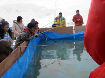 | 今年も釣り堀は人気です。 | 美味しいお魚焼き上がりました。 | ||
